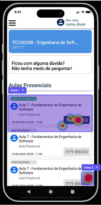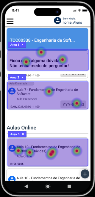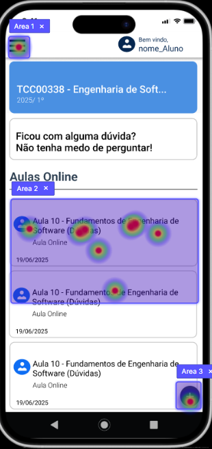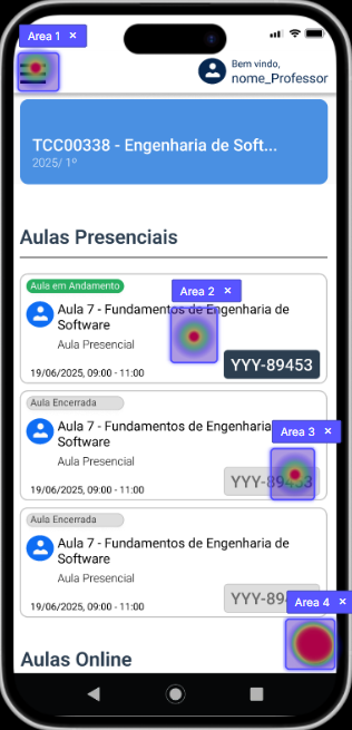 Concluímos que a maioria dos 10 usuários acertaram o local, no entanto alguns ainda clicaram em lugares errados, o que significa que para usuários sem nenhum contexto do funcionamento do aplicativo pode ficar confuso o fluxo do aplicativo. Além disso a área 2 em especifico foi clicada pelo mesmo erro da tarefa 1 em que o fato da imagem ter uma aula em andamento confundiu o usuário.