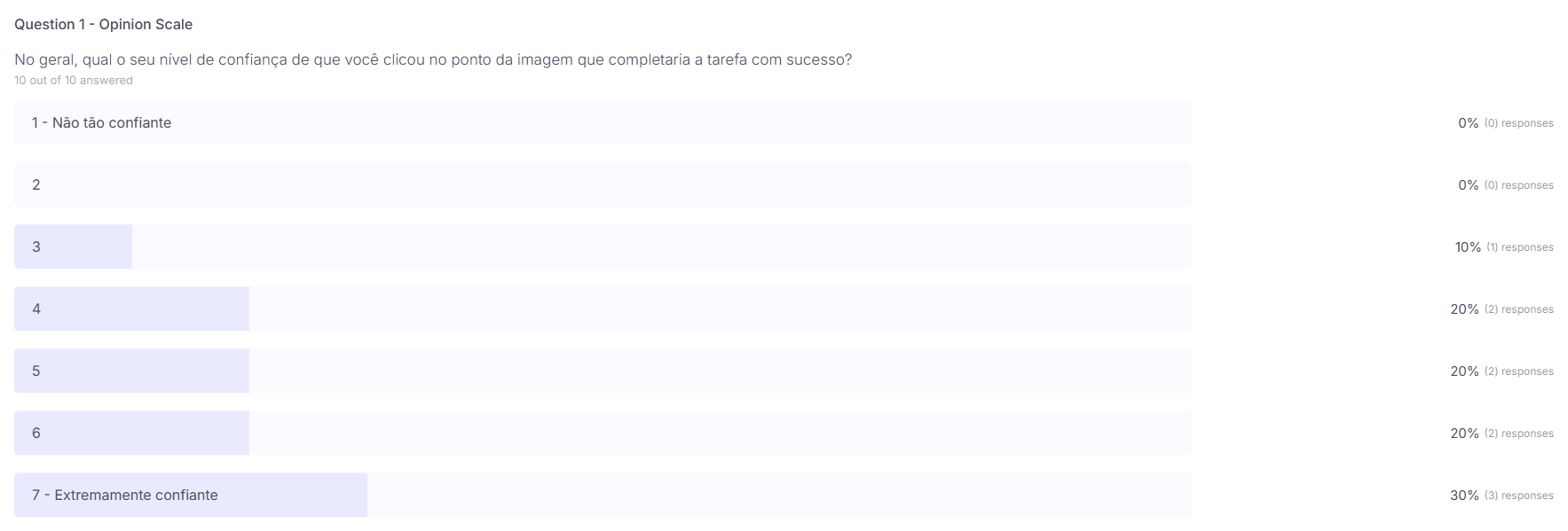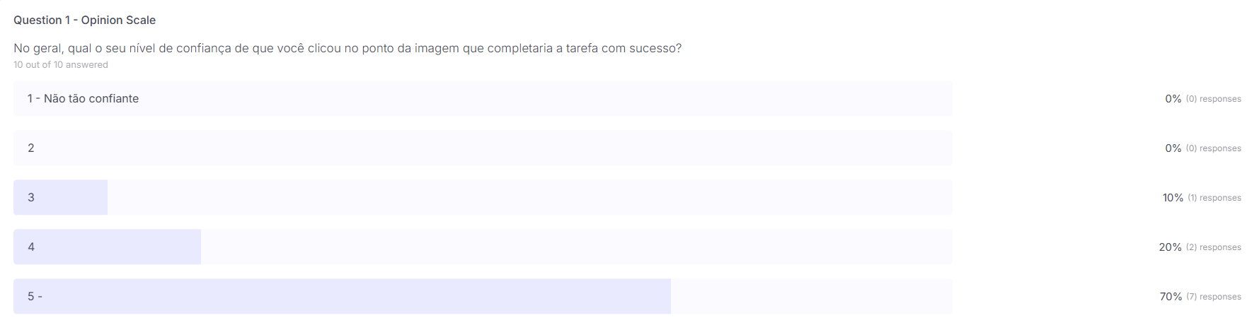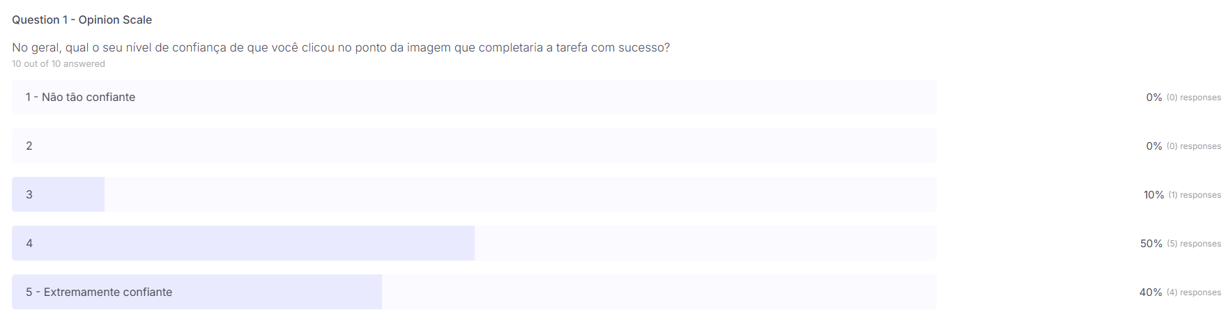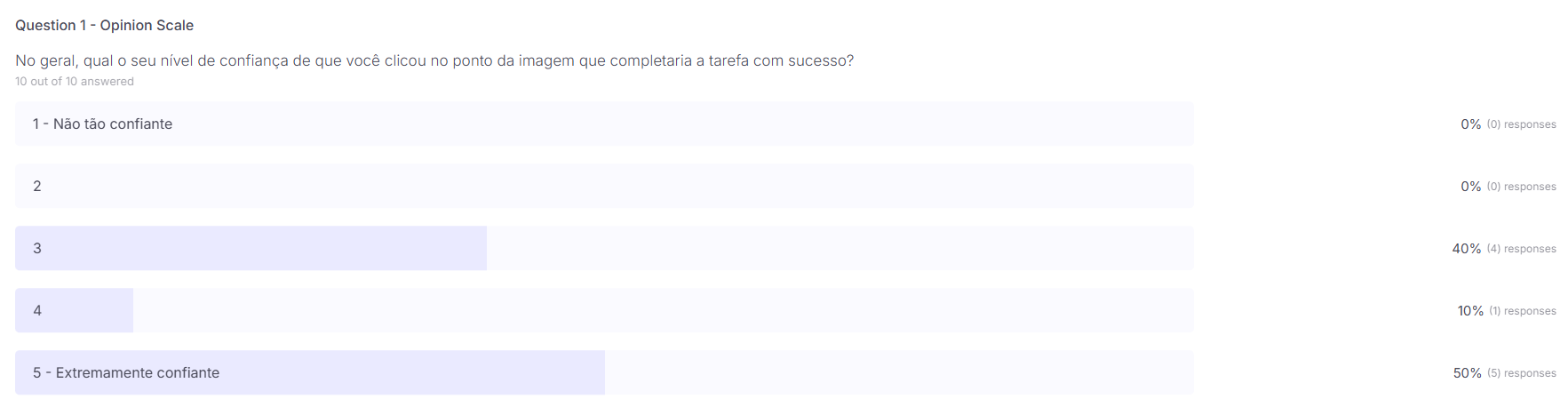 Todas as tarefas foram concluídas com sucesso pelos participantes. Após a realização dos testes, os dados foram extraídos utilizando a funcionalidade de Click Tracking, permitindo identificar precisamente os pontos clicados pelos usuários em cada tarefa.