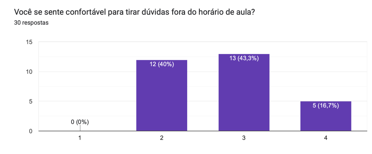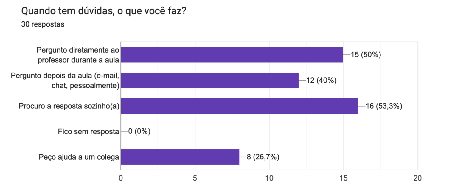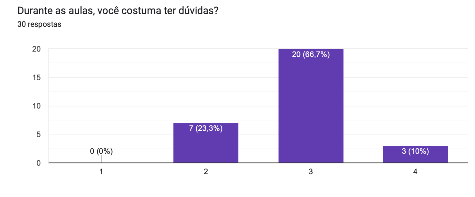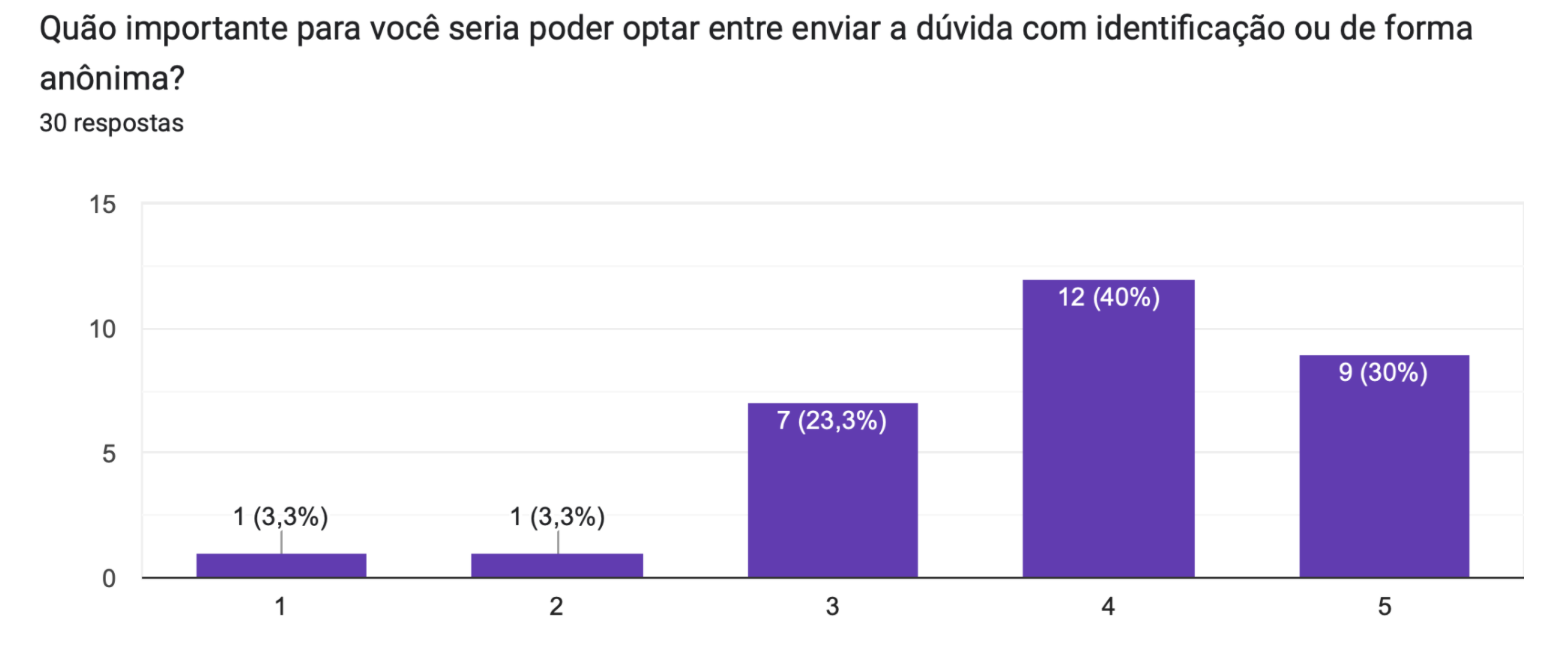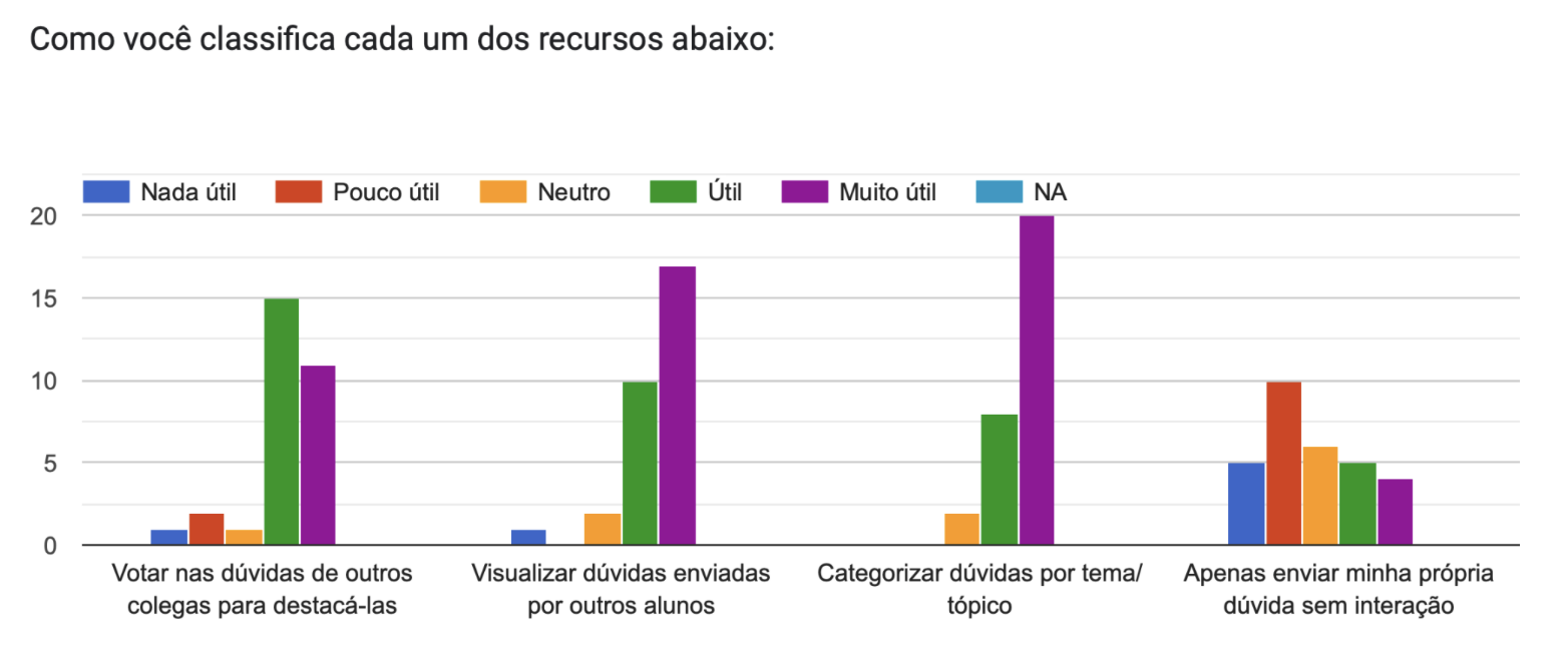 As perguntas foram elaboradas com base nos insights da Matriz CSD e da análise competitiva, e exploraram temas como frequência de dúvidas em aula, conforto ao perguntar, percepção sobre o anonimato e intenção de uso do aplicativo.