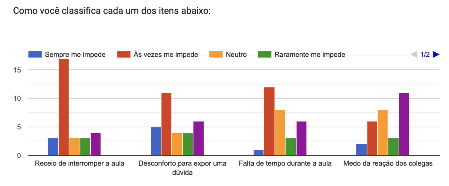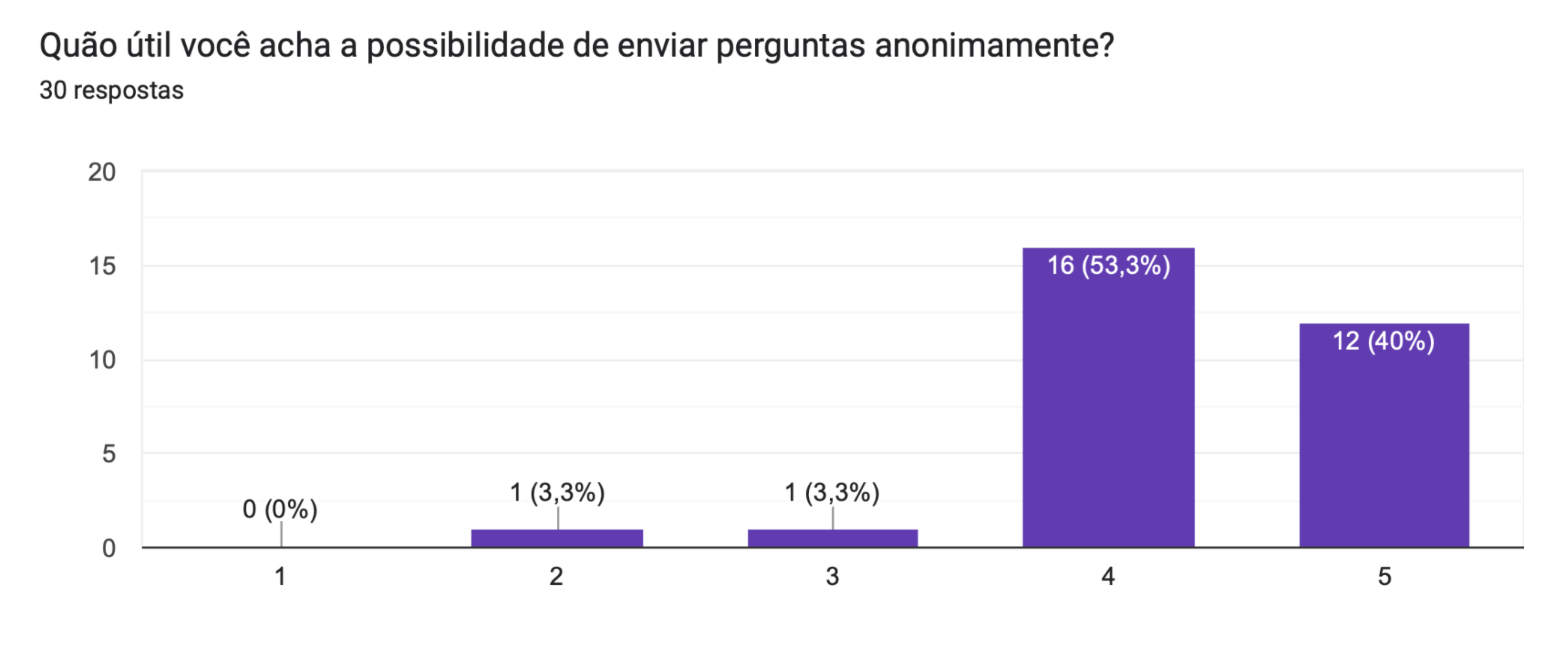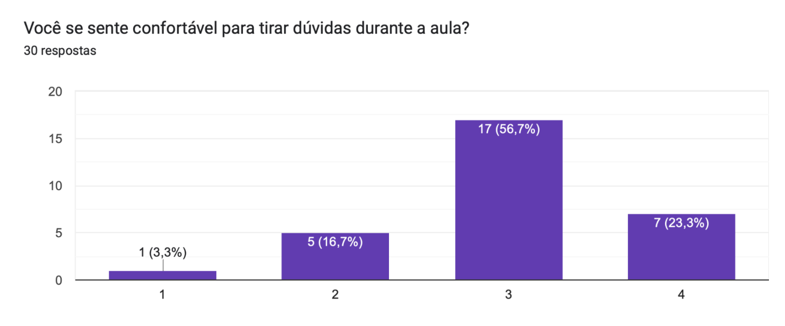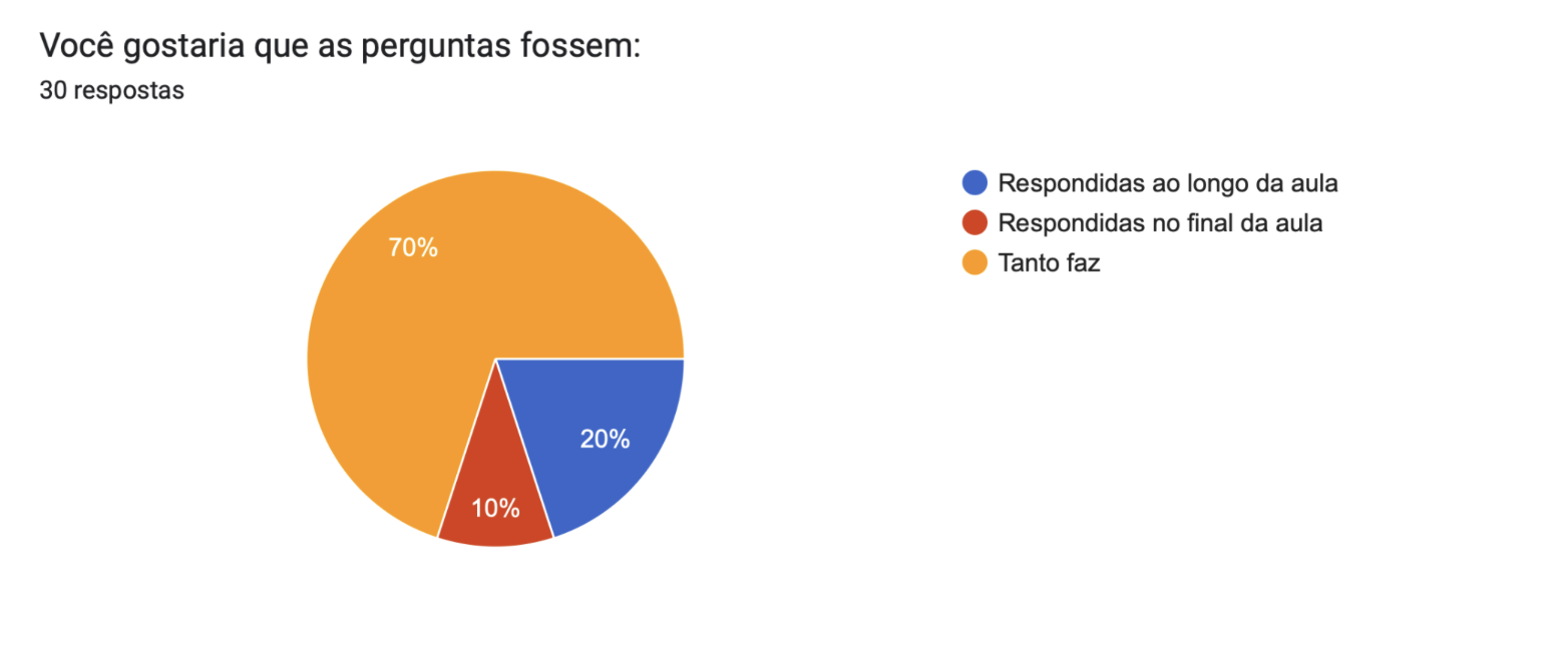 As perguntas abordaram a estrutura da aula, o papel do professor no incentivo à participação dos alunos, e a viabilidade do uso de uma plataforma de perguntas anônimas ou identificadas.